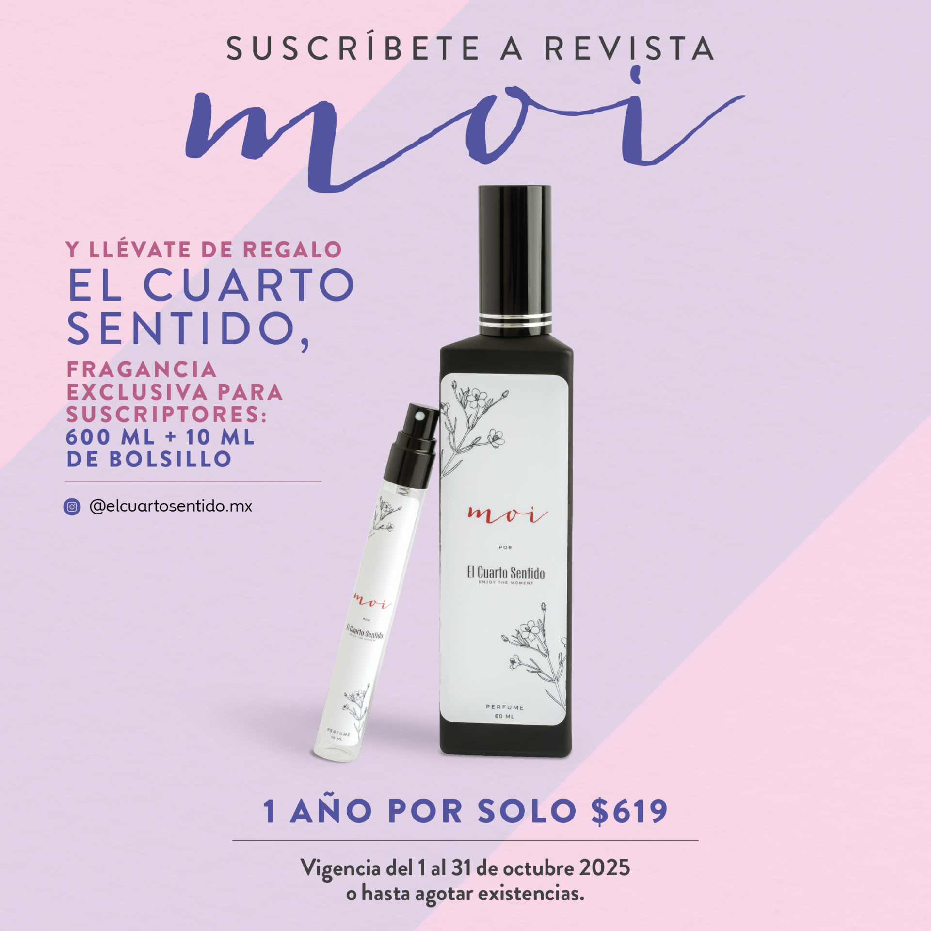 Y lo mejor: viene incluido con tu suscripción a revista moi de octubre. Sí, por solo $619 al año, tendrás tu suscripción print y la fragancia de El Cuarto Sentido para llenar tus espacios de buena energía. ¡Un must absoluto!